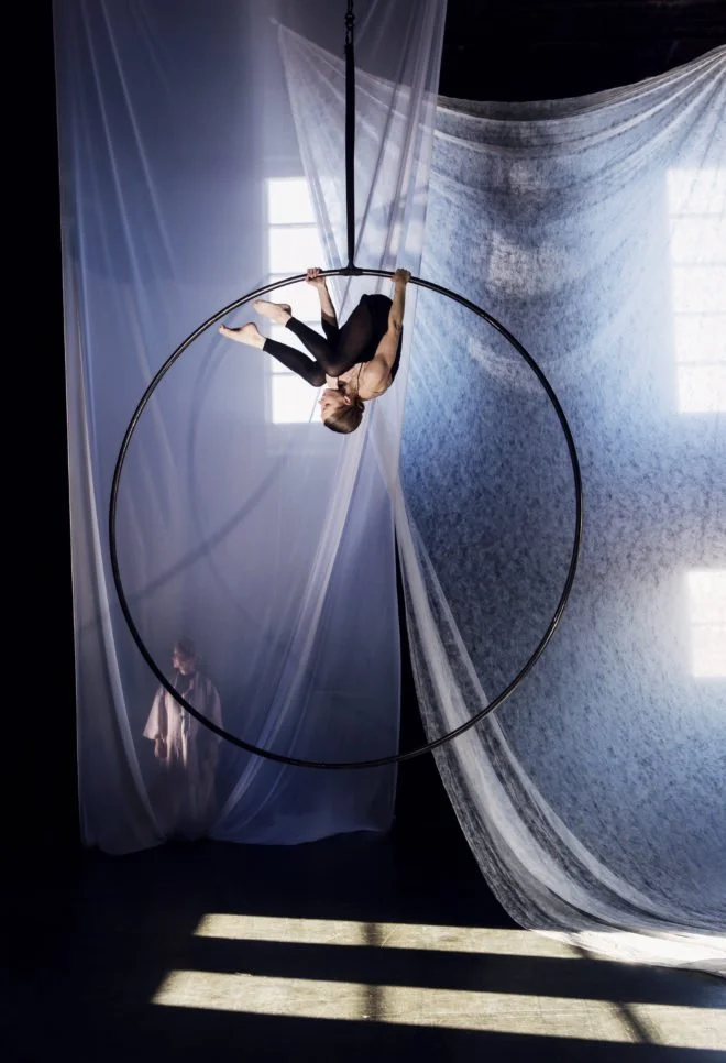 The performance combines Ilona Jäntti’s innovative aerial acrobatics with the music composed and arranged by Aino Venna. The performance studies the interface of exterior and interior, nature and culture, and the turning point of night and day.